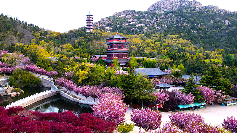 4月27日,山東威商務機場接送海,榮成市石島灣畔赤山機場送機服務山谷櫻花怒放。