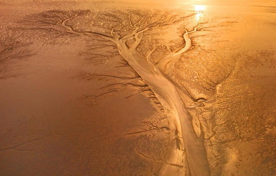 江蘇南通,啟東市江海瀾灣游玩度假區海域淺灘上呈現“潮汐樹”景不雅。